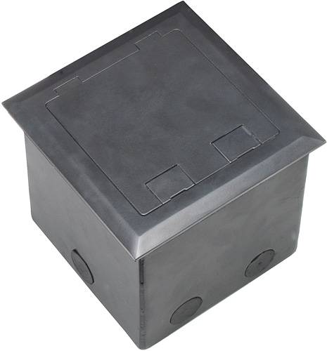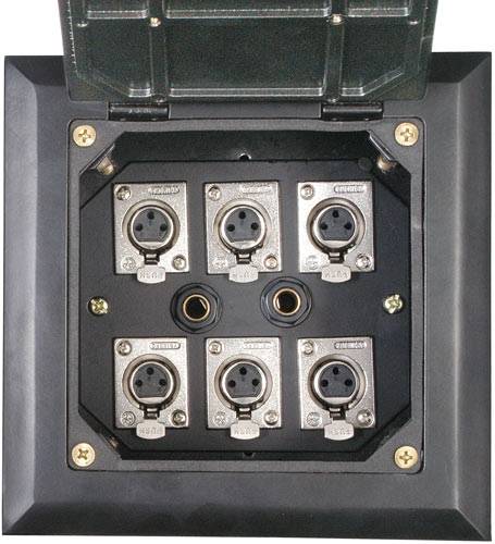 Dayton Professional floor boxes provide an attractive, convenient, and durable means of temporarily connecting mic, line, or speaker cables. Although built to withstand the wear and abuse of floor mounting, they may also be wall mounted whenever that application requires a sleek, stealthy appearance. The beveled faceplates are cast in solid brass, and the other metal parts and fittings are painted or plated, which ensures long-term protection against occasional exposure to moderate moisture. The FB6X includes six female XLR and two female 1/4" connectors loaded in a deep-well housing that permits the lid to be closed when in use. The boxes are intelligently designed and carefully constructed to provide years of exceptional service, and will accept standard knockout cable fittings. *FB6X mounting space requirements: 5.25" square x 5.25" deep *Faceplate dimensions: 5.75" square *Faceplate finish: Black enamel. *Connectors: 6 x XLR female, and 2 x 1/4" TRS female.