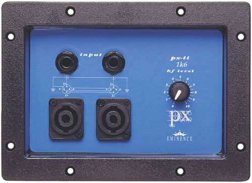 Eminence px cabinet-ready crossovers feature advanced circuit design to both preserve the crossover and your HF drivers. A common crossover problem is L-pad failure brought about by winding burnout when maximum attenuation is prolonged. Full attenuation concentrates the maximum voltage drop in a small winding area - a potentially damaging state even with high-power L-pad devices. In px crossovers, current is limited when the high frequency level control is set to '0' on its scale (±9 dB attenuation). A secondary benefit of the design is to form a voltage divider across the high frequency driver. The high-pass protection uses custom-built aerospace lamps. The tungsten filaments effectively track the program material, dynamically maintaining a safe maximum current level to the high frequency driver without introducing distortion. This circuitry provides smooth 3:1 analog compression during input overload conditions over 250 watts RMS. At full drive level approaching clipping, the electrical attenuation to the protected high frequency driver is -4.5 dB. In every way, Eminence px crossovers are a technically superior product. For use with 8 ohm drivers.