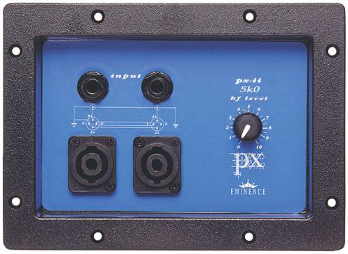 Eminence px cabinet-ready crossovers feature advanced circuit design to both preserve the crossover and your HF drivers. A common crossover problem is L-pad failure brought about by winding burnout when maximum attenuation is prolonged. Full attenuation concentrates the maximum voltage drop in a small winding area - a potentially damaging state even with high-power L-pad devices. In px crossovers, current is limited when the high frequency level control is set to '0' on its scale (±9 dB attenuation). A secondary benefit of the design is to form a voltage divider across the high frequency driver. The high-pass protection uses custom-built aerospace lamps. The tungsten filaments effectively track the program material, dynamically maintaining a safe maximum current level to the high frequency driver without introducing distortion. This circuitry provides smooth 3:1 analog compression during input overload conditions over 250 watts RMS. At full drive level approaching clipping, the electrical attenuation to the protected high frequency driver is -4.5 dB. In every way, Eminence px crossovers are a technically superior product. For use with 8 ohm drivers.