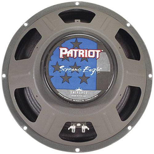 Nothing says "American Made" like rock 'n roll or blues. And nothing says "Classic" tone like the Patriot Series of guitar amp speakers from Eminence. Made in the U.S.A. for stand-up volume and reliable rockin' clarity. Seven-year manufacturer's warranty. • scream'in ea'gle - n. a loud, bright and well-defined 12" American guitar speaker Specifications: • Power handling: 50 watts RMS • VCdia: 1.75" • Impedance: 8 ohms • Frequency Range: 65-5,500 Hz • Sensitivity: 101 dB 1W/1m • Magnet weight: 38 oz. • Dimensions: Overall Diameter: 12.02", Cutout Diameter: 10.97", Mounting Depth: 5.1".