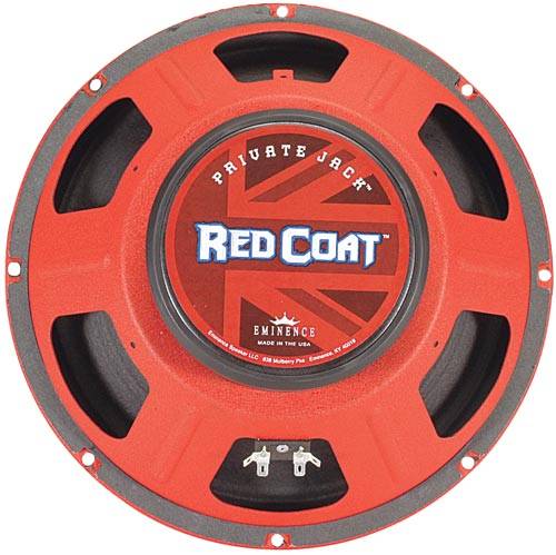 It all started with the British Invasion, that unmistakable sound that took America by storm from across the Atlantic to right in your face. And now Eminence puts it within easy reach with the Red Coat™ series of guitar amp speakers. Engineered and manufactured in the U.S. with British-inspired cones, making it easy to "Pick Your Sound." Seven-year manufacturer's warranty. • pri'vate jack - n. namesake of the famous British canine and one of the most recognized British tones for guitar Specifications: • Power handling: 50 watts RMS • VCdia: 1.75" • Impedance: 8 ohms • Frequency Range: 70-5,000 Hz • Sensitivity: 101 dB 1W/1m • Magnet weight: 38 oz. • Dimensions: Overall Diameter: 12.02", Cutout Diameter: 10.97", Mounting Depth: 5.1".