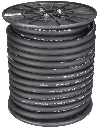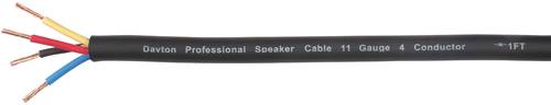 Dayton Professional cable is designed from the ground up to guarantee the best possible transfer of signal from your amplifier to your speakers. It also possesses quality materials and superior construction that will provide years of service in all portable and touring pro sound applications. The cable features high strand-count pure copper conductors, and durable PVC insulation and outer jacket. Available by the foot, as well as 30m (99 ft.) and 100m (328 ft.) spools. Specifications: *Conductors: 4 x 11 ga. (52 x 28 ga.) *Insulation colors: blue, yellow, black, and red *Jacket: Black PVC, 15.0mm (.591") O.D.