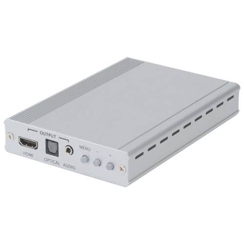 HDTV resolutions from 480i through 1080p are supported, as are video input resolutions up to 1920 x 1200. Automatic detection of the native resolution allows the unit to set the output signal to the optimum capability of the display or you can manually adjust the settings via the intuitive on screen menu. Compliance with HDMI v1.2, HDCP 1.1, and DVI 1.0 has been met for a worry-free experience. Includes scaler, power supply, 4 ft. VGA male to male cable, and a 6 ft. stereo RCA to stereo 3.5 mm plug adapter cable. Dimensions: 1" H x 4" W x 5-3/4" D.