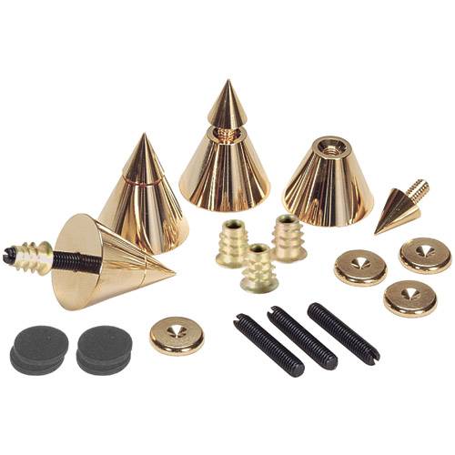 By rigidly coupling a loudspeaker enclosure to a floor by means of a "spiking" system, it is possible to dramatically improve clarity, stereo imaging and bass response. This is very apparent with subwoofer systems. These attractive spikes are precision machined from solid brass and then plated with a durable gold finish. Each cone spike weighs 86 grams and measures 1-1/4" diameter and 1-1/2" tall. The two piece threaded tip design allows for precise level adjustment. T-nuts and threaded studs are included for mounting in cabinets with walls up to 1" thick. Set includes 4 gold cone spikes, 4 gold floor discs, 4 T-nuts and 4 threaded studs. Threads are M6.