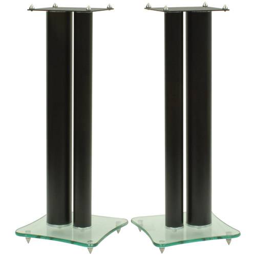 Dayton Audio speaker stands are the ideal accessory to your home theater or stereo sound system, raising the speaker to the optimum listening height while providing a sturdy foundation. The overall design of these speaker stands is an experience in subtle detail. The bottom plate is an elegant 3/8" clear glass with adjustable chrome spikes and measures 9-1/2" x 9-1/2". The two textured aluminum posts that support the top plate are capped at each end with a chrome ring to accent the speaker stands. The front post is 2" in diameter; the rear post is 2.75" in diameter and hides the speaker cable from sight. Both posts can be filled for added mass (we recommend sand or shot in ziplock type bags). The top plate is 1/8" thick with four adjustable spikes to support the speakers and measures 5-7/8" x 7". The overall height of the stand is 24-3/8" and weighs 16.5 lbs. per pair.