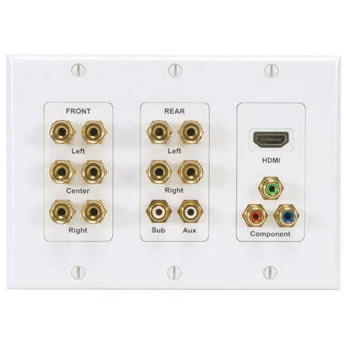 Finish your home theater installation with the custom Dayton Audio 5.1 channel audio with HDMI and component video wall plate. Connection for five speakers (5-way binding posts that accept up to 12 AWG wire), two line-level RCA cables (one subwoofer, one AUX or digital audio), one HDMI cable, and one component video are provided to offer a complete all-in-one wall plate solution for home theater enthusiasts with HDTVs. Each connector features 24k gold plating to present a pure path for signal, and the HDMI connection cable features a unique flexible extension to reduce cable stress and fatigue. The triple-gang design uses three Decora-type inserts that the connectors populate. Each set of connections has been labeled to eliminate cable connection confusion. A three-gang cover plate is included, as are all connectors and mounting screws. Some assembly required.