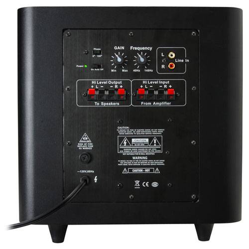 Specifications: • Power output: 80 watts RMS • Frequency response: 40-140 Hz • Box design: Ported • Inputs: RCA line level & speaker level • Outputs: Speaker level • Crossover frequency control: Continuously variable from 40 Hz to 140 Hz @ 12 dB/octave • Phase switch • Auto on/off • Dimensions: 12-3/4" H x 12-3/16" W x 14-3/8" D.