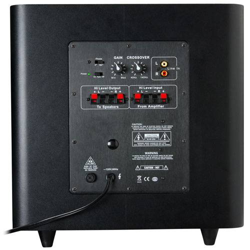 Specifications: • Power output: 100 watts RMS • Frequency response: 30-140 Hz • Box design: Ported • Inputs: RCA line level & speaker level • Outputs: Speaker level • Crossover frequency control: Continuously variable from 40 Hz to 140 Hz @ 12 dB/octave • Phase switch • Auto on/off • Dimensions: 14-3/4" H x 14-3/16" W x 15-3/4" D.