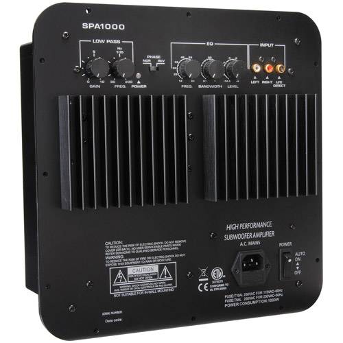 Specifications: Rated power output: 497 watts into 8 ohms, 950 watts into 4 ohms with 0.92 % THD (based on one-third power duty cycle) *S/N ratio: 98 dB (A-weighted) *Low-pass crossover: 30 - 200 Hz, 24 dB/octave *Input voltage: User switchable 115/230V (Euro cord available) *Dimensions: 11-15/16" W x 11-15/16" H x 5-1/4" D. Cutout dimensions: 10" W x 10" H.