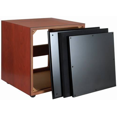 All SWC cabinets use the Dayton Audio B-REX removable/replaceable baffle exchange system. The 1" thick MDF blank baffles are custom-cut by the user to fit a given driver and amplifier, and are then fastened securely (permanently or not) into the enclosure. These stout, CNC-cut boxes are constructed from 3/4" MDF side panels backed up by a 1" x 3" cross brace, resulting in a rigid, well-damped subwoofer cabinet. Finishes match the popular Dayton Audio speaker cabinetspolished gloss black lacquer, and lush natural cherry or maple hardwood. A new high-value textured black vinyl covering is available for projects that demand a more understated appearance while enjoying the benefit of greatly reduced cost. Note: These cabinets do not have cutouts for amplifiers or woofersyou will need to cut your own holes per your design. Each enclosure includes two black satin finish baffles (one each, front and back) with mounting hardware, a magnetically attached grill, and four rubber feet fastened by 6 mm barbed inserts. The barbed inserts are compatible with Dayton Audio cone spikes, available separately. * Net volume: 2.0 cu. ft. * External dimensions: 17" x 17" x 15-7/8"