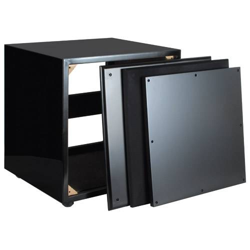 All SWC cabinets use the Dayton Audio B-REX removable/replaceable baffle exchange system. The 1" thick MDF blank baffles are custom-cut by the user to fit a given driver and amplifier, and are then fastened securely (permanently or not) into the enclosure. These stout, CNC-cut boxes are constructed from 3/4" MDF side panels backed up by a 1" x 3" cross brace, resulting in a rigid, well-damped subwoofer cabinet. Finishes match the popular Dayton Audio speaker cabinets—polished gloss black lacquer, and lush natural cherry or maple hardwood. A new high-value textured black vinyl covering is available for projects that demand a more understated appearance while enjoying the benefit of greatly reduced cost. Note: These cabinets do not have cutouts for amplifiers or woofers—you will need to cut your own holes per your design. Each enclosure includes two black satin finish baffles (one each, front and back) with mounting hardware, a magnetically attached grill, and four rubber feet fastened by 6 mm barbed inserts. The barbed inserts are compatible with Dayton Audio cone spikes, available separately.