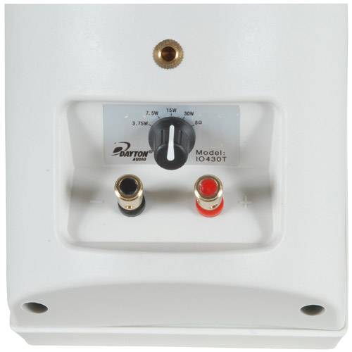 Designed to withstand the elements and the abuse of daily use, the Dayton IO430 will inject life into a party or add that extra ambiance to an outdoor cafÉ. The unique 3-way design improves off-axis response making these less sensitive to placement than other outdoor speakers, and the dedicated 70V transformer eradicates complex impedance balancing issues. Each speaker features two 4" polypropylene woofers with rubber surround, a 5/8" polycarbonate tweeter, and a custom piezo super-tweeter for extended high-frequency response. A sealed cabinet design keeps moisture out and minimizes internal oxidation. Includes mounting brackets and hardware, and 5-way binding posts are featured for easy connections. Specifications: *Power handling: 70 watts RMS/150 watts max *Transformer: 70V, taps at 3.75W, 7.5W, 15W, 30W, and 8 ohm bypass *Frequency response: 70-20,000 Hz *Sensitivity: 89 dB 1W/1m *Dimensions: 4-1/2" H x 12-1/2" W x 6-5/8" D.