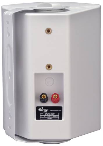 This Dayton Audio all-purpose 2-way speaker system is perfect for a deck or patio and is ideal for use as home speakers. They feature a 5-1/4" polypropylene cone woofer with a rubber surround and a 5/8" polycarbonate tweeter to produce smooth detailed sound. Wet or dry these speakers are ready to perform. The weather-resistant ABS speaker cabinets and painted aluminum grills provide protection for use outdoors under an awning or soffit (not in direct contact with rain or sun). Includes "U" style brackets, mounting hardware and gold plated 5-way binding posts. They are also available in both white and black to easily blend into any decor. Specifications: *5-1/4" Polypropylene woofer with rubber surround *5/8" polycarbonate tweeter with ferrofluid *Frequency response: 70-20,000 Hz *4 ohm impedance *Power handling: 50 watts RMS/100 watts max *Sensitivity: 89dB 1W/1m *Threaded brass inserts for use with swivel type speaker brackets *Dimensions: 9-11/16" H x 7-1/16" W x 6-9/16" D *Mfg. #IO520W *Sold in pairs.