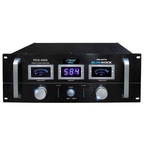 The Blue Rock PDG5000 cranks out 5000 Watts peak power. Each channel features precision individual level controls, a power switch and power LED, and LEDs which indicate signal, clip and fault. Four-pole Speakon connectors and binding post jacks are both provided for output. The binding posts accept banana plugs or bare wire. Housed in a rugged, all-steel chassis, the PDG5000 will have no problem coping with the rigors of day-to-day usage. The PDG5000 boasts extensive protection and diagnostic capabilities. Output Current Limiting circuitry protects the amplifier output stage from damage caused by short-circuit loads. DC Protection disconnects the loudspeaker load in the event of an output DC offset exceeding 2V. The high-voltage power supplies are protected by a circuit breaker, and the Thermal Protection circuit protects you from overheating. Of course, prevention is the best protection. Internal heat sinks and efficient forced-air fans prevent excessive thermal buildup to begin with. Pyle has been in business for over 35 years, and their manufacturing experience and expertise is easy to see - and hear.