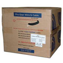 Pro Gear CCS RG-6 Dual Quad coax, black, 500ft reel-in-box. This RG-6 coaxial cable is swept to 3.0 GHz. It has 60% aluminum braid/40% aluminum braid and 100% aluminum foil. The center conductor is 18awg copper clad steel. UV inhibitor jacket. UL and CL2 approved.