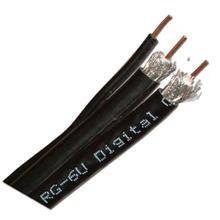 Skyline CCS RG-6 dual coax, with 17awg messenger wire attached, black, 500ft reel-in-box. This RG-6 coaxial cable is swept to 3.0 GHz. It has 60% aluminum braid and 100% aluminum foil. The center conductor is 18awg copper clad steel. UV inhibitor jacket.